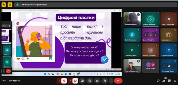 Важливою складовою заходу став виступ представника Національної поліції, яка поінформувала здобувачів освіти про основні види кіберзлочинів, поширені загрози в онлайн-просторі та відповідальність за протиправні дії в мережі. Особливу увагу було приділено питанням недопущення кіберзлочинів, правилам безпечної поведінки в Інтернеті та алгоритму дій у разі виявлення підозрілої чи небезпечної активності.