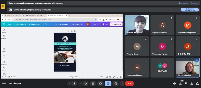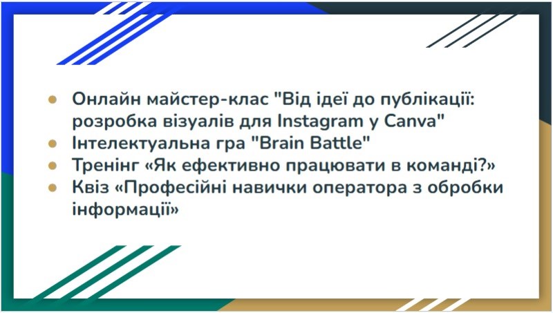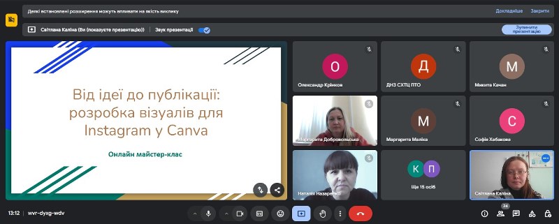 На майстер-класі було розглянуто роботу з шаблонами та створення унікальних макетів, секрети поєднання кольорів, шрифтів і графічних елементів, принципи дизайну, що привертає увагу та сприяє взаємодії з аудиторією, а також практичні лайфхаки для швидкого створення контенту.