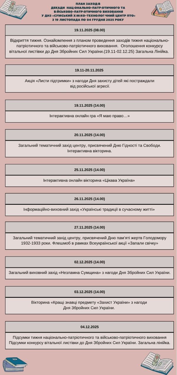 У ДНЗ «Сумський хіміко-технологічний центр ПТО» відбулася загальна лінійка, присвячена Дню пам’яті жертв Голодомору 1932–1933 років. Захід було проведено в рамках декади національно-патріотичного та військово-патріотичного виховання з метою вшанування мільйонів невинних жертв та формування в здобувачів освіти історичної пам’яті, громадянської свідомості й поваги до трагічних сторінок минулого України.
