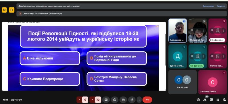 Особливою та зворушливою частиною стало вшанування пам’яті Героїв Небесної Сотні хвилиною мовчання під музичний супровід «Пливе кача…». Учасники також взяли участь в інтерактивній онлайн-вікторині «День Гідності та Свободи».