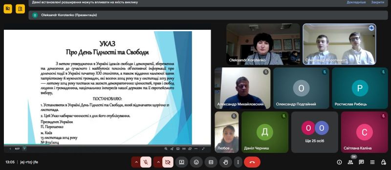 Виховний захід, присвячений Дню Гідності та Свободи, спрямований на формування у здобувачів освіти патріотичних почуттів, поваги до історії України та героїв, які боролися за незалежність і свободу. Учасники поглибили знання про ключові події Помаранчевої революції 2004 року та Революції Гідності 2013–2014 років, усвідомивши їхній вплив на становлення сучасної української держави.