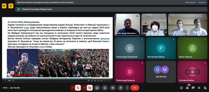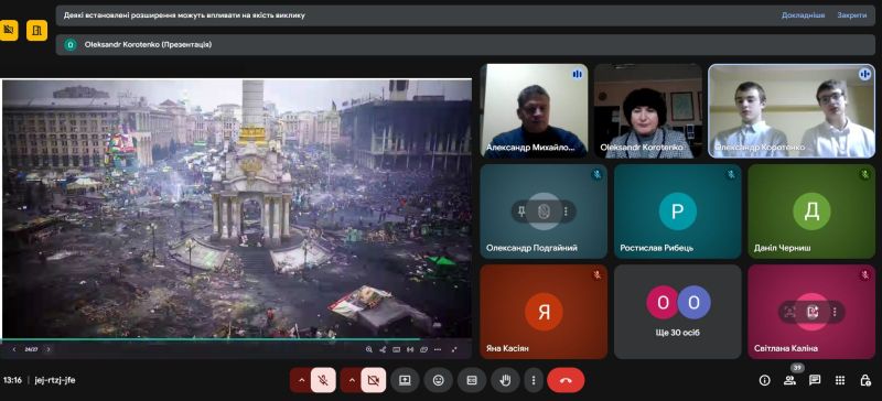 Під час заходу прозвучало вступне слово заступника директора з НВР Н.П. Макотренко, яке акцентувало увагу на значенні гідності, свободи, громадянської відповідальності та ролі молоді у творенні майбутнього України. Ведучі представили історичну довідку про події Майданів, а викладач історії Михайловський О.В. продемонстрував хронологію Революції Гідності та її суспільно-історичне значення.